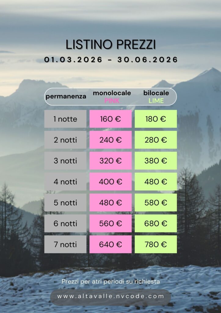ALTAVALLE HOLIDAY HOME offre un monolocale (PINK) ed un bilocale (LIME) confinanti con ambiente rustico-moderno, luminoso con una splendida vista sulle montagne, entrambi con 3 posti letto. Situato 200 m dalla via principale del centro di Chiesa in Valmalenco e 2 km dalla funivia Snow Eagle. Ampio parcheggio gratuito 100 m dalla casa.